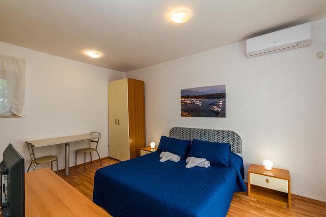 - • • Studio : chambre avec un lit double, cuisine et salle de bain.